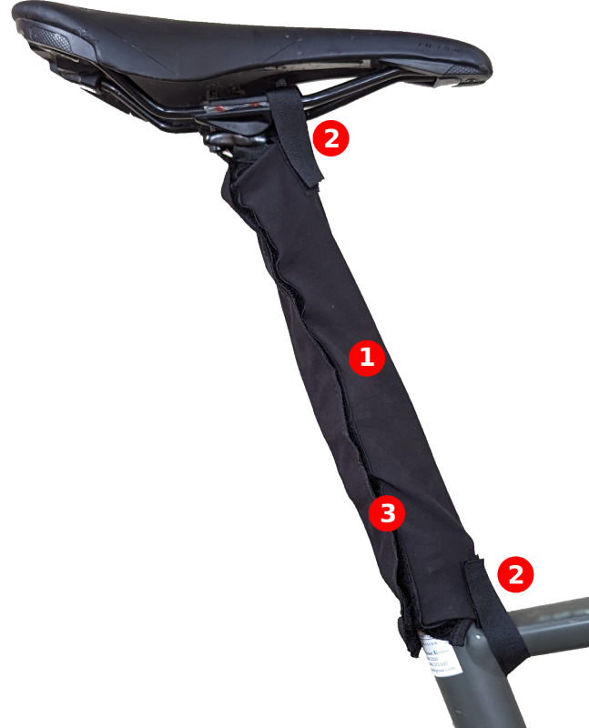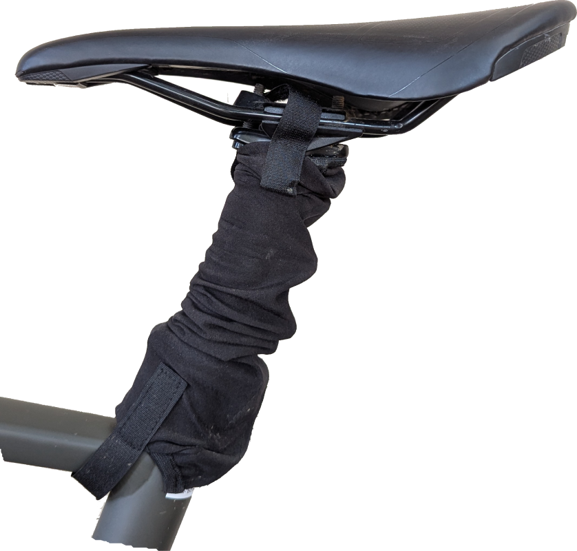 2. Velcro straps secure Dropper Saver to your seat and frame. Elastic ensures a tight seal.